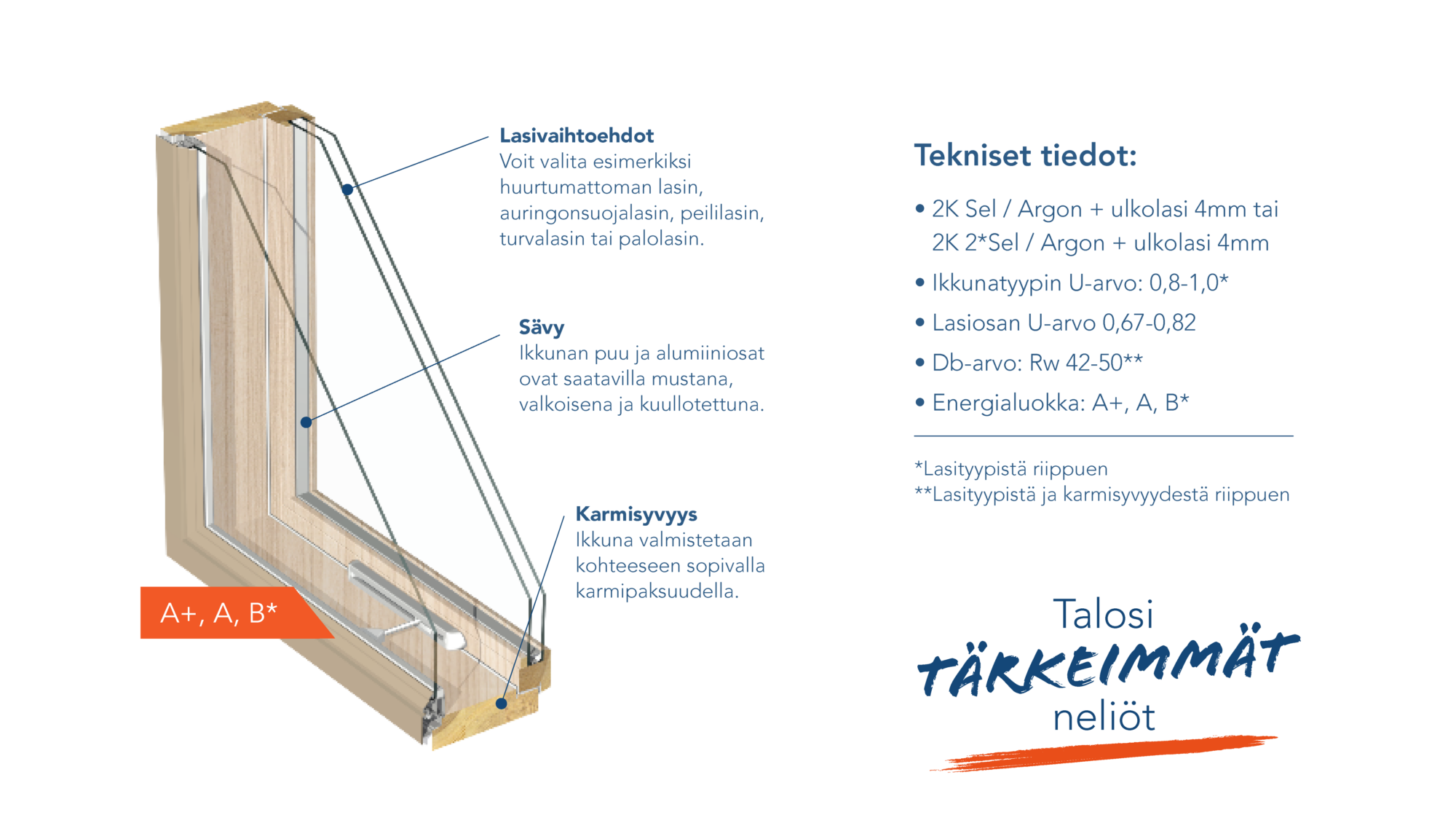 Puupuite eristää erinomaisesti lämpöä sekä ääntä ja alumiinipuite tekee ikkunasta ja sen karmirakenteesta säänkestävän. Oikein valittu ikkunatyyppi lisävarusteineen lisää merkittävästi kodin asumismukavutta ja viihtyisyyttä.